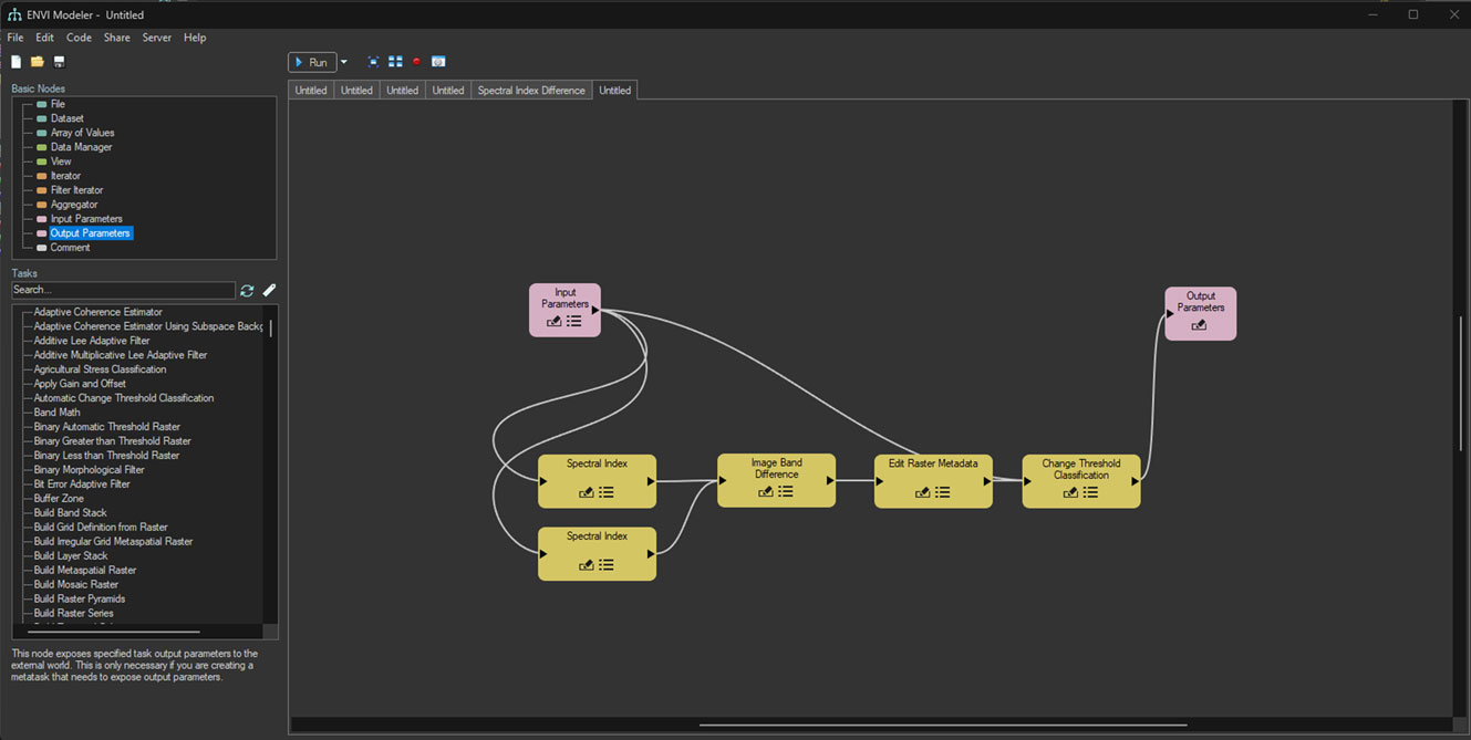Pro tip: If you want to know what your tool looks like, you can hit the “run” button once to set the input parameters and see the interface before you are done. I use this to see parameter ordering or naming and make changes to feel and look like other ENVI dialogs.