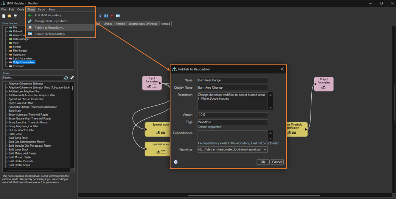 In the ENVI Modeler UI, select “Share” and then “Publish to Repository.” This will open our publishing dialog which has a few fields for you to populate. Below is an example showing the pattern we follow in ENVI for display name and name, where the display name is easy to read and the name has no spaces present.