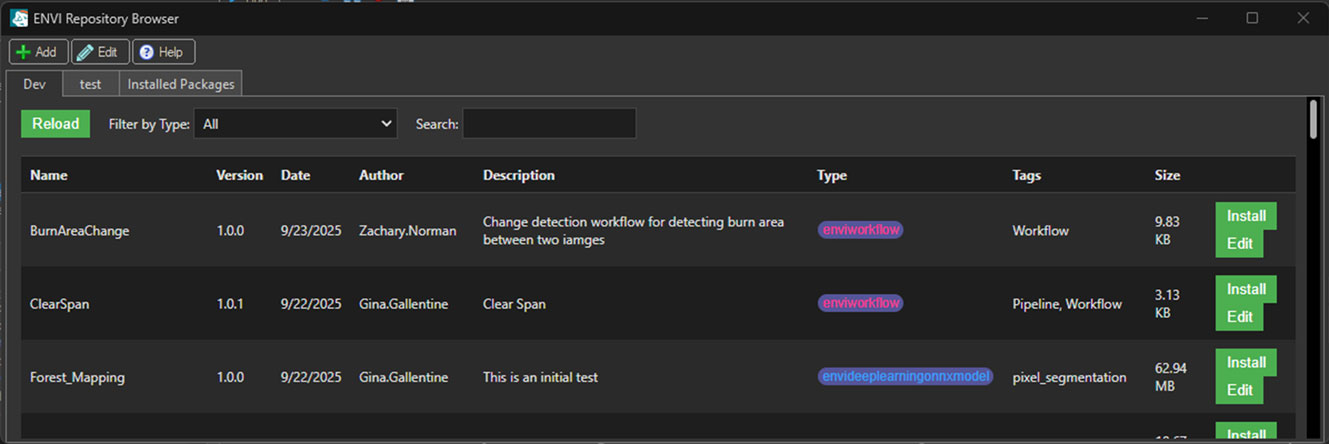 Once published, you can navigate to the Repository Browser in ENVI and see that it’s now live! Here’s a screenshot showing my ENVI Modeler Workflow as the first row in the Analytics Repository: