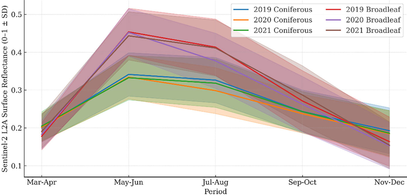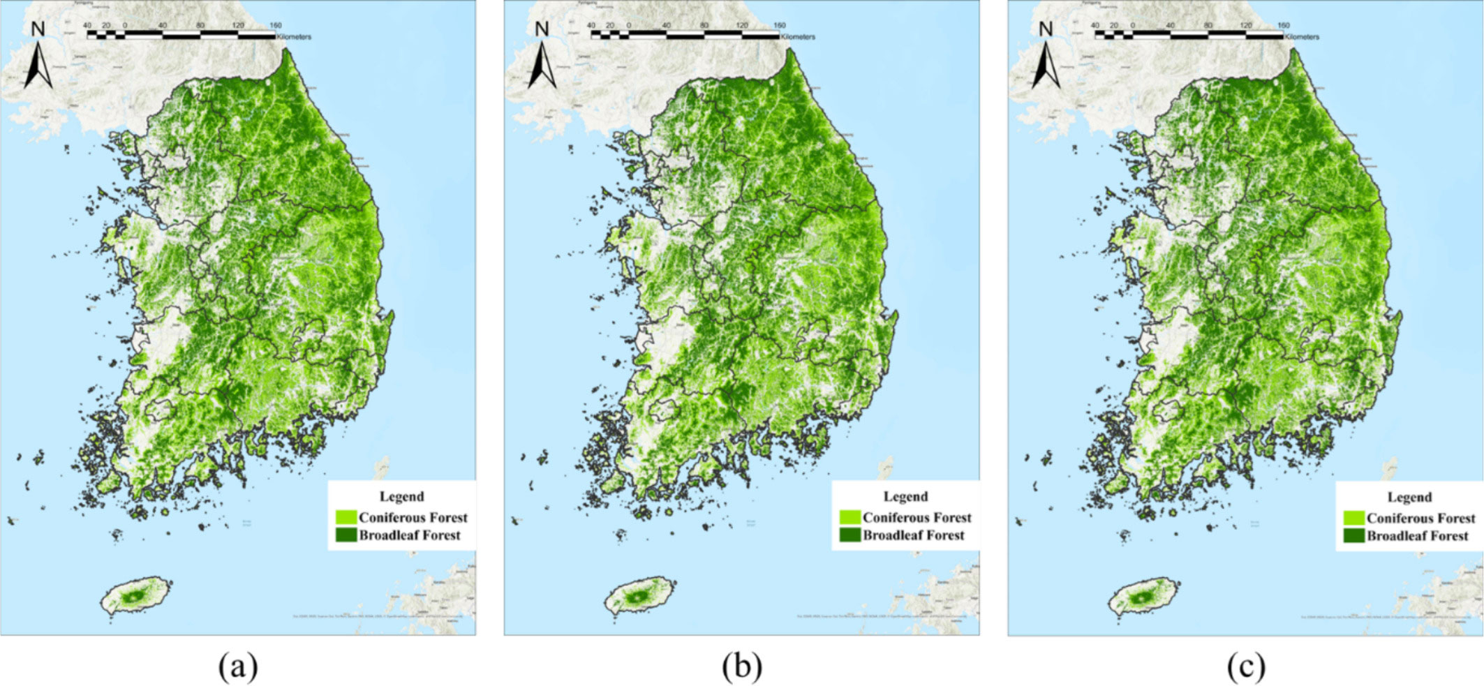 With the ENVI Deep Learning module, they trained a U-Net model using forest-type maps from the Korea Forest Service as reference data, achieving a balanced classification between coniferous and broadleaf forests. Once trained, the model was applied nationwide to produce annual forest-type maps for 2019, 2020, and 2021.