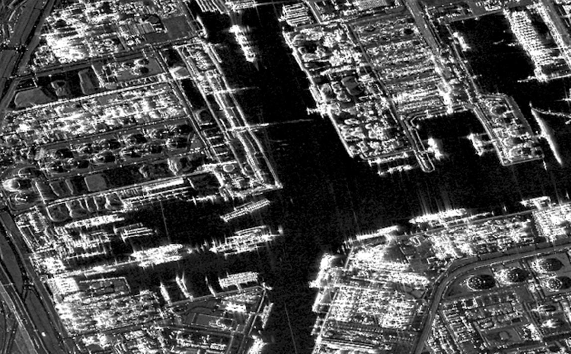 Geocoded, multi-looked, filtered image of Rotterdam Port, Netherlands. Source: Capella Space Open Data Gallery.