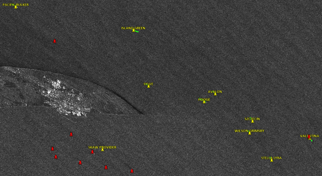 Ship detections and corresponding AIS labels near Denmark. Source: European Union, Copernicus Sentinel-1 imagery. AIS data were provided by the Danish Maritime Authority.