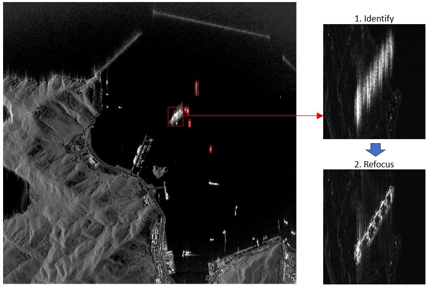 Example of detecting and refocusing a moving object, which is determined to be a cargo ship. Source: Capella Space Open Data Gallery.
