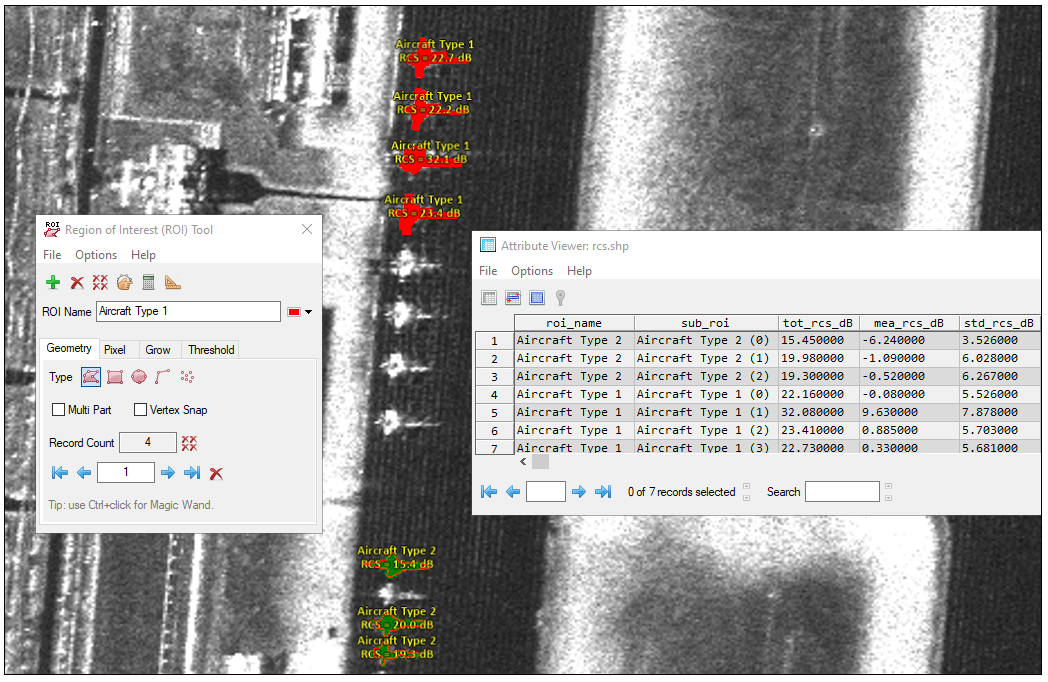 In simple terms, an object's Radar Cross Section (RCS) determines how detectable it is by radar systems. It represents how much electromagnetic energy an object reflects back to a radar receiver. RCS is a valuable metric used in the defense industry, as it can indicate the detection level of enemy aircraft by radar. The SAR Radar Cross Section tool estimates the RCS of objects that you mark with polygon Regions of Interest (ROIs).