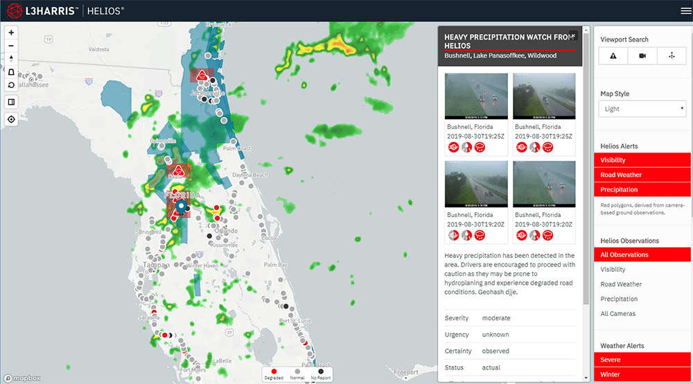 Before, during, and after both Hurricane Florence and Dorian, NV5 (formerly L3Harris) opened up its powerful Helios® real-time weather intelligence tool to allow more than 2,500 emergency managers, transportation officials, and residents free access to monitor the road conditions themselves. Helios uses machine learning to automatically filter through thousands of traffic and web cameras in the Helios network. During severe weather events, Helios boosts confidence in understanding ground conditions as it detects hazardous road conditions, such as pooling water. Helios improves the efficiency and effectiveness of disaster response and recovery, providing a unified operation picture to quickly deploy resources to the hardest hit areas.