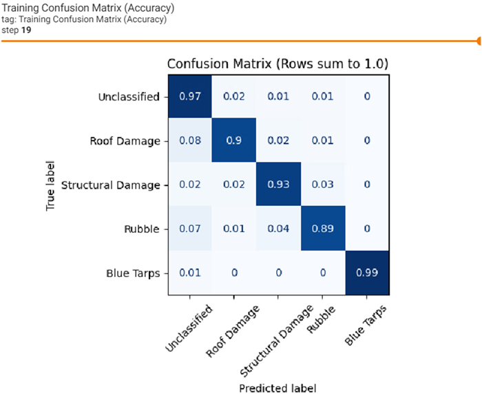In the loss plot in the step above, notice the divergence of the validation line (green), versus train (pink), and batch (blue). This can be due to several factors, the most obvious factor comes from viewing the individual class accuracy metrics and confusion matrices. In the TensorBoard dashboard, select SCALARS, then click Class Accuracy to expand the accuracy plots for each class. Below are the two extremes: the worst class accuracy, Structural Damage on the left, and best class accuracy, Blue Tarps on the right. The train and validation values for class Structural Damage are moving in the opposite direction. Blue Tarps train and validation values are in sync, looking at the confusion matrix can help show why this is occurring.