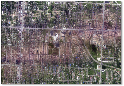 Subsets of public-domain Emergency Response Imagery of the Joplin, Missouri tornado in 2011. Images are courtesy of the National Oceanic and Atmospheric Administration (NOAA), National Geodetic Survey (NGS), Remote Sensing Division and are available at https://storms.ngs.noaa.gov/. The images have three bands (red/green/blue) at 0.25-meter spatial resolution. They were exported to ENVI raster format for the tutorial. Spatial reference information was added to each image based on information from the source JPEG world files. The original images were acquired from an airborne Emerge/Applanix Digital Sensor System (DSS) on 24 May 2011.