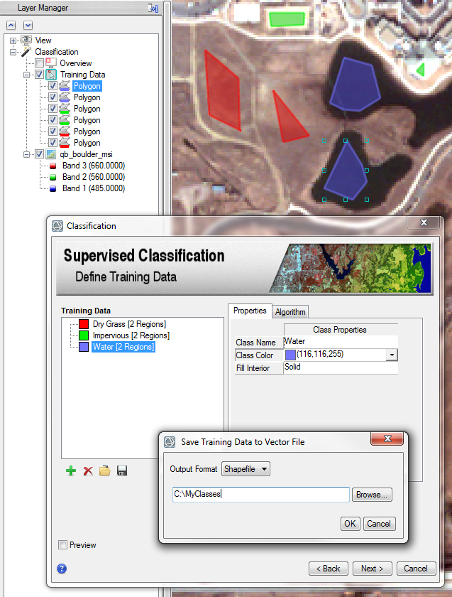 - To assign a training region to a different class, first select the class that you want to assign it to. Then select the training region. It changes color to reflect the newly assigned class.