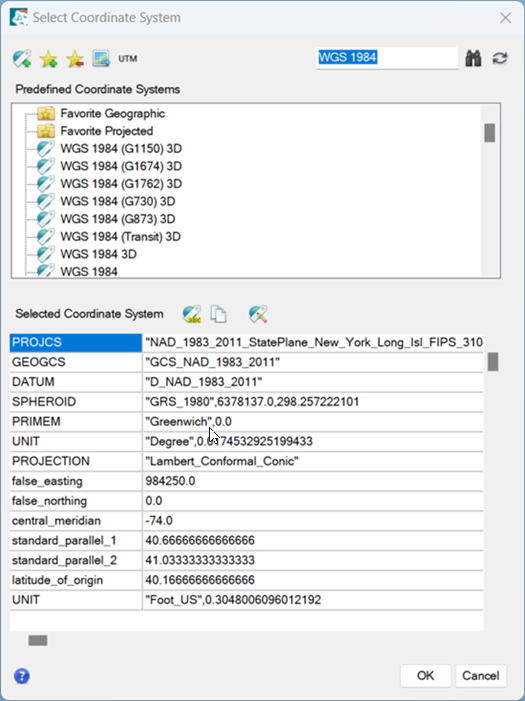 - Type WGS 1984 in the search field of the Select Coordinate System dialog, and press the Enter key.
