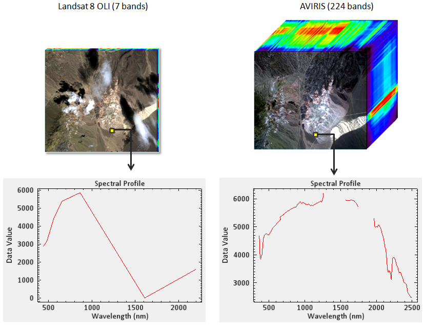 The high spectral resolution from an imaging spectrometer allows you to identify materials, whereas broadband sensors such as Landsat TM only allow you to discriminate between materials. We will demonstrate these concepts in the steps that follow.