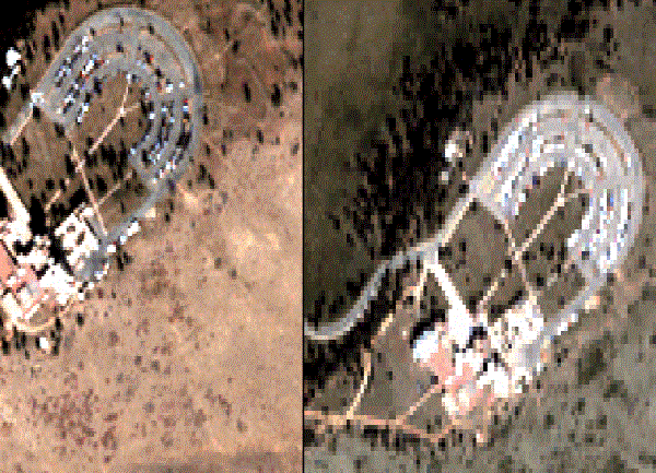 - Click Next to proceed to the Tie Points Generation panel. Two separate views are created. The left view contains the base image (quickbird_2.4m.dat), and the right view contains the warp image (ikonos_4.0m.dat). The views are geographically linked; when you explore one view, the other view updates automatically. The following figure shows the side-by-side images zoomed out to their full extent:
