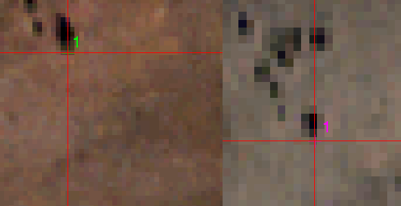 Click a row label (1, 2, etc.) or use the arrow buttons to select a record in the table. Crosshairs from the Cursor Value tool mark the location of that tie point, and both views are centered at the selected tie point; for example: