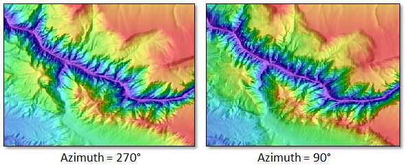 - Enter an Azimuth angle in degrees. This is the compass direction that the sun is facing, relative to geographic north. Azimuth is only used with the Shaded Relief option. Azimuth values increase in a clockwise direction from 0 degrees (north) to 360 degrees. The default value is 45 degrees. Modifying this value will affect the locations of shadows in the hillshade image, which helps to emphasize terrain features and valleys. In the following example from the preview window, an azimuth value of 270 degrees creates a more natural illusion of depth in a river gorge: