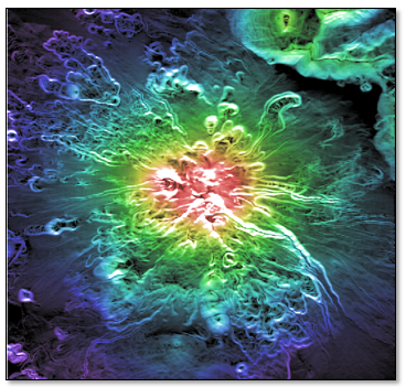 The brightest pixels in this image represent steeper slopes. An HLS color blending highlights the slopes better than the Standard (RGB) option would.