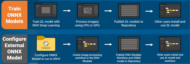 - Models that are trained in ENVI Deep Learning 4.0 will be created as ONNX models.